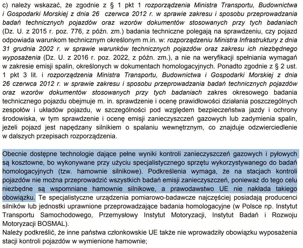 Fragment odpowiedzi Ministerstwa Infrastruktury z 10 stycznia 2022 r. (sygn. DTD-7.054.24.2021), w którym wskazano, że badanie techniczne pojazdu nie obejmuje weryfikacji spełniania wymagań homologacyjnych w zakresie emisji spalin. Ministerstwo podkreśliło, że stacje kontroli pojazdów nie dysponują sprzętem umożliwiającym kompleksowe badania zanieczyszczeń gazowych i pyłowych, a prawodawstwo UE nie nakłada takiego obowiązku. Źródło: odpowiedź Ministra Infrastruktury na interpelację nr 29041 (10.01.2022)